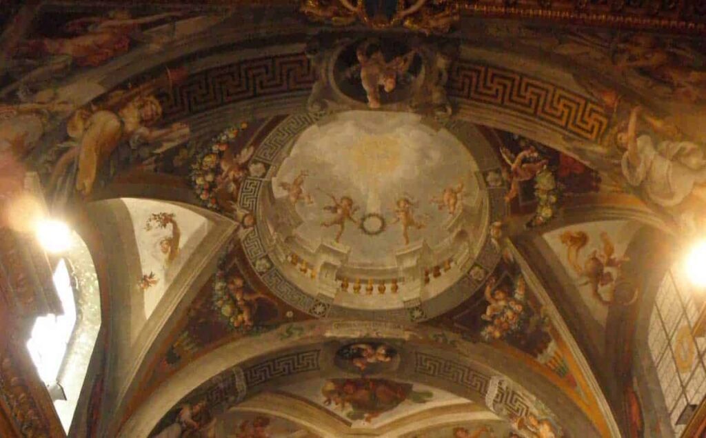 Dos ilustres pintores del renacimiento, Polidoro da Caravaggio y Maturino, trabajaron tanto en esta capilla como en el claustro que por desgracia fue destruido. Aquí estuvieron entorno a 1524 poco antes de que el Sacco de Roma destruyera toda una época y una forma de vivir en la ciudad. Pero precisamente aquí, antes de que llegaran las lágrimas traídas por las tropas imperiales, Polidoro da Caravaggio supo mezclar en sus colores la risa de Fra Mariano con la de Magdalena. Hermosas y complejas historias del Renacimiento en Roma.